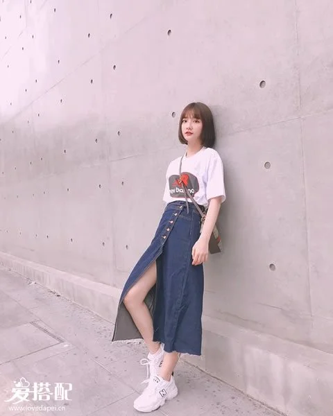 想更加女人一些,用白色运动鞋搭配这样的中款牛仔裙,前开叉的设计更有女人味。