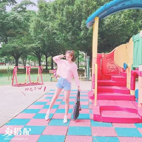 小白鞋搭配牛仔短裤,上穿一件粉色宽松T恤,上松下紧的穿搭特别时尚。