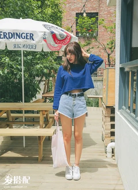 蓝色也是夏季的流行色,蓝色短版上衣搭配浅色牛仔裤,搭配白色运动鞋,性感又时尚。