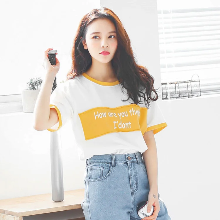 纯棉短袖t恤。 黄色和白色的完美搭配,不仅满满的透着运动的清春的活力感。而且版型也很完美,最大的有点就是显瘦,穿起来给人一种小鸟依人的美感,搭配各种浅色的裤裙都很完美。