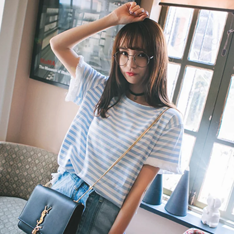 小清新t恤。 很有海魂衫的感觉,但是做了一点点的改动,让它成为了姑凉们的专属衬衫,在袖口的地方就如了白色蕾丝的设计,所以这样看起来就多了一份秀美,配上浅色的牛仔裙一定很美丽。