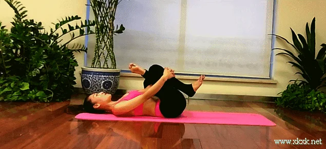 弯曲双膝,右脚踝放于左膝盖上方,双手环抱左小腿,靠近腹部,上身放松,肩胛骨沉向腰线。吸气时拉左腿再次靠近身体、呼气时右膝盖远离身体。保持3~5个呼吸后反向拉伸。放松犁状肌,拉长美化臀部线条。