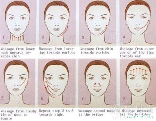 想学杏儿的V面,我们还可从脸部按摩入手。人的脸部与颈部周围有许多淋巴组织,只要在每天保养过程中,加入轻柔手势动作进行引流,可排出脸部多余的水分。可参考以下步骤,排走脸上水肿。