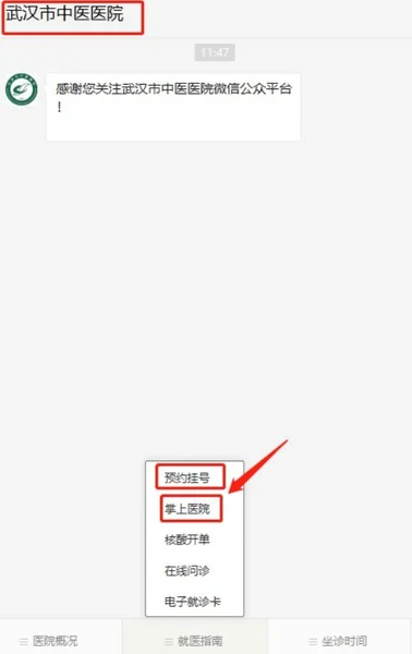 1. 公众号---“武汉市中医医院”,点击就医指南---预约挂号或掌上医院,---选择科室或专家---选择您合适的时间进行预约,免除您长时间排队等待与院内人员聚集。