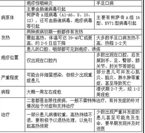 与令家长们头痛的手足口病相似,疱疹性咽峡炎也没有特效药。而它们都属于传染性疾病,以接触传播为主,常由柯萨奇病毒等肠道病毒所引起,症状与传播非常相似。不过。疱疹性咽峡炎致病性没有手足口病厉害。他们的主要异同如下表: