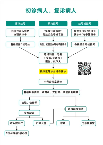 关注”协和江南医院“公众号或者是官微--微信、支付宝办理电子健康卡--选择科室、号别(专家号/普通号)医生、就诊人--候诊区导诊台排号就诊--缴费--检查--取药