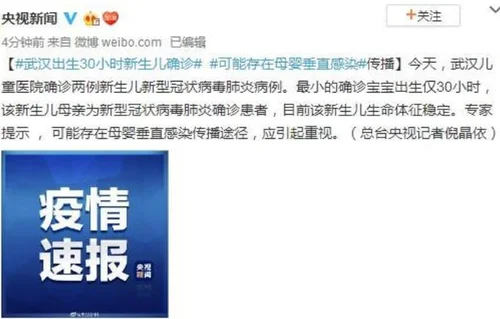 武汉儿童医院确诊两例新生儿新型冠状病毒肺炎病例。最小的确诊宝宝出生仅 30 小时,该新生儿母亲为新型冠状病毒肺炎确诊患者,目前该新生儿生命体征稳定。专家提示 , 可能存在母婴垂直感染传播途径,应引起重视。