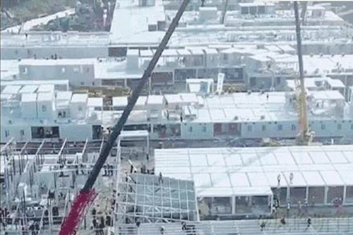 2020年2月4日,湖北武汉。武汉洪山体育馆方舱医院进入施工布置的收尾阶段。从2月3日晚开始,武汉市连夜建了三所方舱医院,分别是洪山体育馆(800张床位)、武汉客厅(2000张床位)、武汉国际会展中心(1000张床位),专门收治确诊的轻症患者。