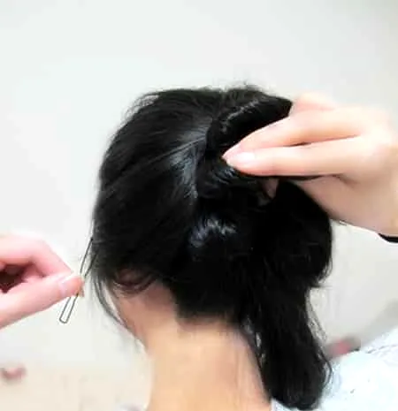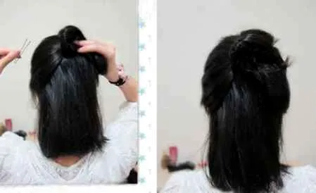 余下头发均匀分成两份,先用一边扭盘,用U型夹固定。
