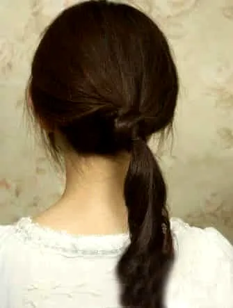 第四步:再次用上面的头发先用黑夹夹住,将下面头发的发尾部低低的绑一个斜斜的马尾。