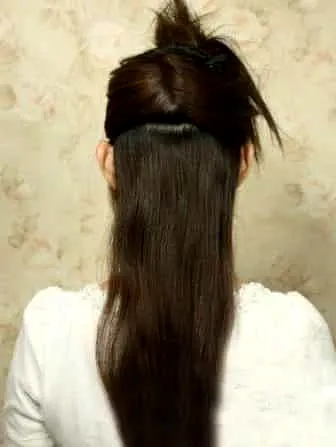 第一步:首先将头发放在后背,然后用夹子将上面的部分头发固定在上面。