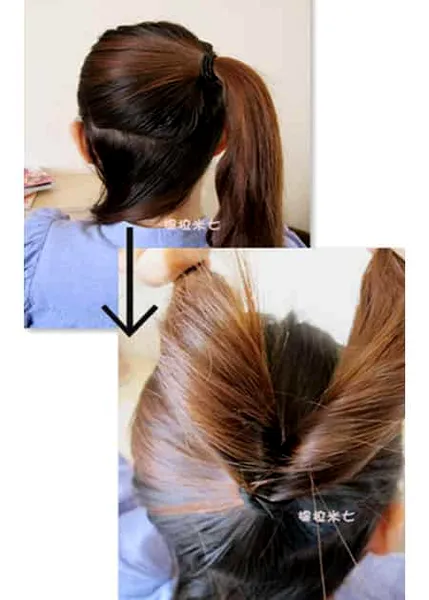 step1、首先扎一个马尾,下面稍微的留出一些头发来。再将马尾的发束分成两份抓起来。
