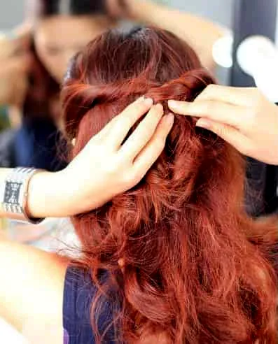 第二步:然后用卡子固定在后脑勺,记得固定在后脑勺的中间部位用同样的方法把右侧的头发也固定在后脑勺,然后两个交叉放在一起固定住。
