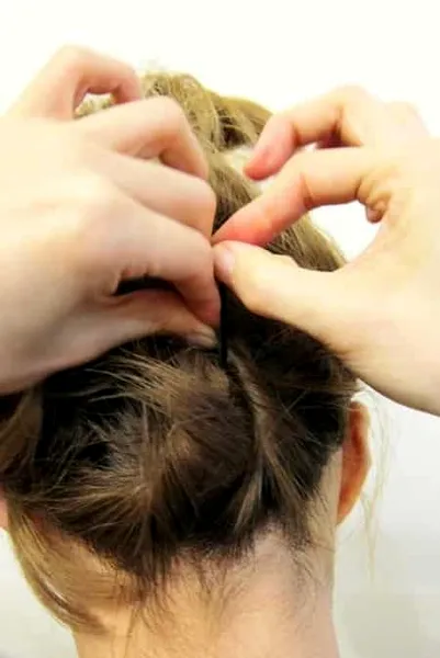 3、将小马尾下面、太阳穴旁的头发挑成一搓,以顺时钟或逆时钟方向旋转至马尾中心的下方(旋转方向顺手就好),然后用小黑夹固定。