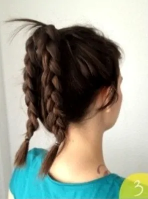 步骤三:把马尾分成两个部分,分别编成麻花辫,然后用小皮筋扎好。