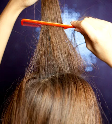 如果是发量少的MM,可以先用梳子将头顶的头发倒梳打毛,形成支撑,让发顶瞬间饱满起来。
