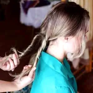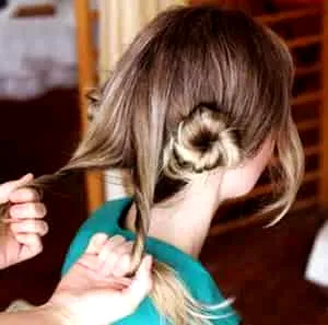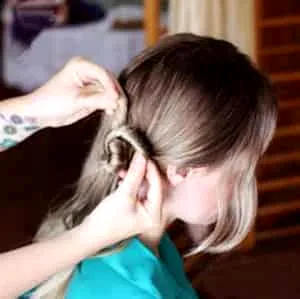 气质盘发步骤四:将中间剩下的头发分成等量的两份,然后抓住发尾向一侧扭转。