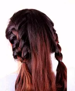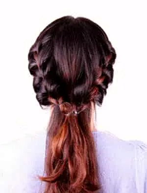 盘发步骤二:将编好的两个麻花辫相交于中间位置,用小橡皮筋将两个发辫固定到一起。
