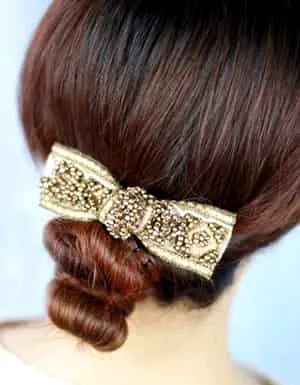 第二款盘发效果图:将扭转的发束盘在一起,给人感觉十分精致**,没有过多的处理充满简约大气之美。加上蝴蝶结的发饰显得更加优雅高贵。