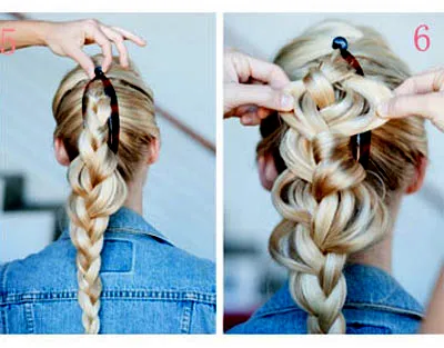 Step3:别以为这样就结束了哦,小心机就在这里了,用竖状发夹在后脑勺将辫子固定起来,拉松发辫四周,如图。
