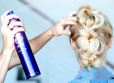 Step7:为了让发型更完美,找到自然的发胶,稍微隔远一点在辫子上喷一点。