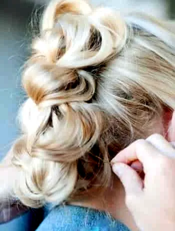 Step6:卷好后,就可以用发夹从下往上别在里面,一般来说左右分别固定好后,再根据松度进行调整。
