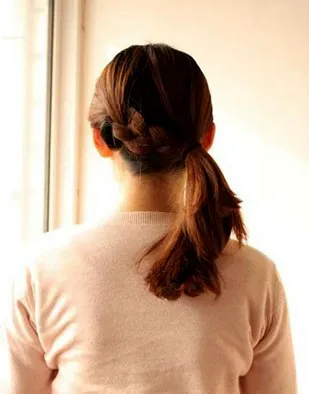 步骤四:将辫子连同其余的头发一起扎成一个马尾。