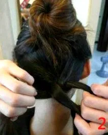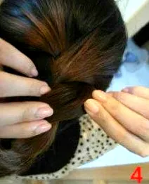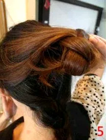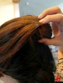 步骤六:辫子卷的位置要在靠近头皮的地方,再用发夹来固定住,做成一个小发簪。发根上面稍微有一点的膨胀感没关系,还可以有一种“扣逃”的效果。