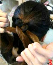 步骤五:上下部分的辫子都已经编完就要开始进行下一步了,将上面部分的辫子慢慢的从发尾往内卷的方式,卷的时候要和上图一样的效果。