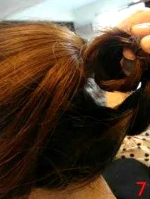 步骤七:上面部分的头发完成之后,现在来编下面的头发。下面部分的头发是要从发尾的地方往上面来卷,制造出一种纯碎的自然气息。