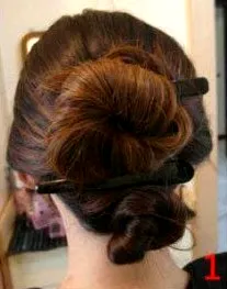 步骤八:当卷到已经快靠近到上面部分已经固定好的发簪位置时,就算是可以了。接下来,再使用发夹将其头发固定住,这样这个盘发就算是完成了。
