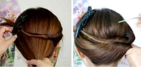 Step 1:将右边的头发朝同一个方向卷成一缕,用夹子固定在左边图示位置。