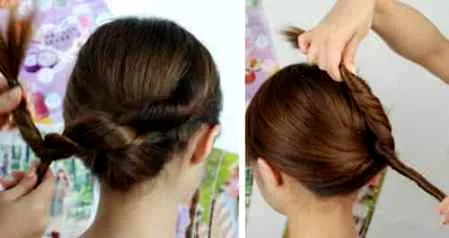 Step 3:把步骤一固定的头发和步骤二反方向扭转的头发,继续扭转。