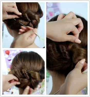 7、然后将之前扭转的头发两束头发缠绕一起扭转,一直绕一直绕。
