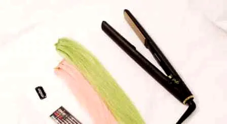 步骤1:首先要准备好挑染头发所需要物品,粉嫩的假发片一条或是若干条,以上准备的的是粉色和冰激凌绿色假发片,黑色卡子、电夹板、针线、梳齿比较细密的梳子。