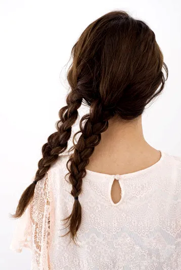 再将两只辫子缠绕在一起。