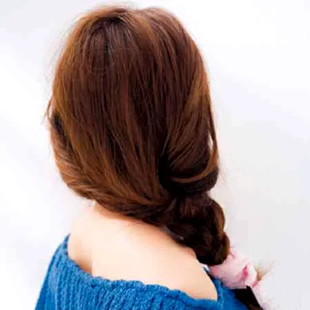 编成蓬松的马尾发辫后,用橡皮筋将发尾固定好,再配上装饰品就可以完成了。