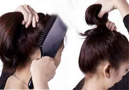 给密齿梳喷定型胶,让那一小束头发绕发髻。将剩下的头发编织成三股辫,最后将发尾固定好即可。