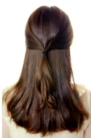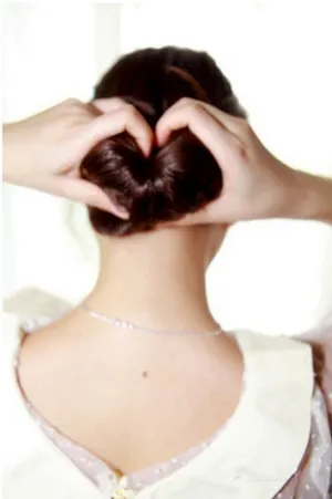 步骤一:头发梳顺之后,挑一点太阳穴高度的头发,量不用多,松松的绑在脑后,用小号皮筋就行了。