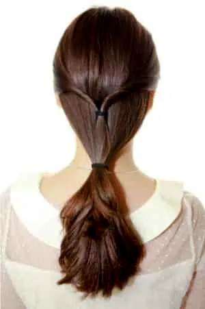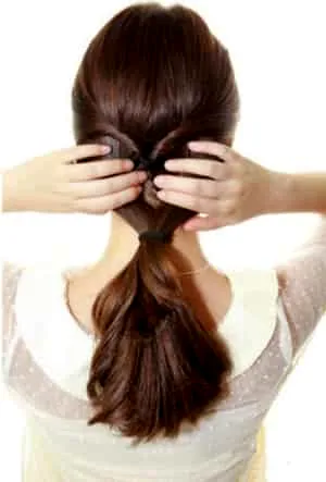步骤五:将大马尾向上翻起,先塞皮筋部分,然后是发尾,一点一点的往洞里塞。