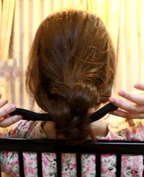 步骤五:然后取一个黑色的盘发器,把发尾和前面两侧头发放进盘发器里。