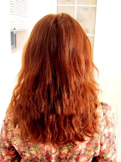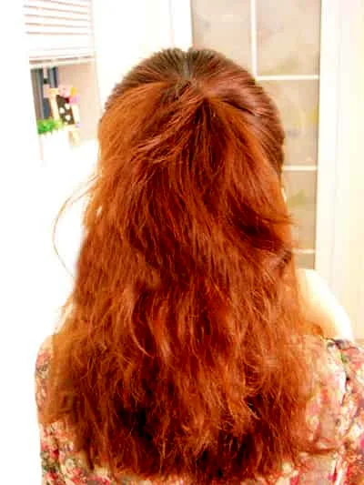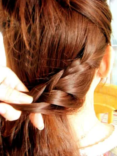 步骤四:把刚刚打蓬的头发分成均等的两等份,并向着外侧扭转着编发。