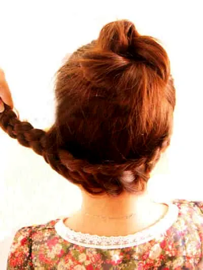 步骤六:将编好的辫子向上盘成一个花苞的形状,并用小发卡把发尾固定。