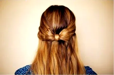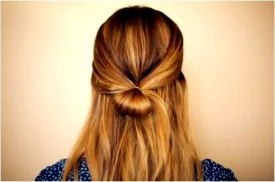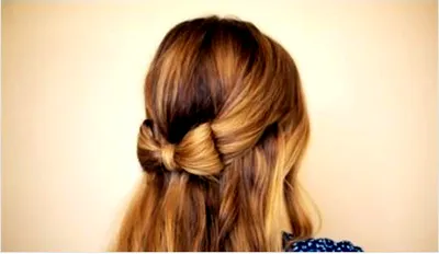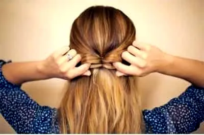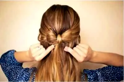 步骤5:接着将余下的马尾向上翻,塞进蝴蝶结中间之后,将头发拉下来。