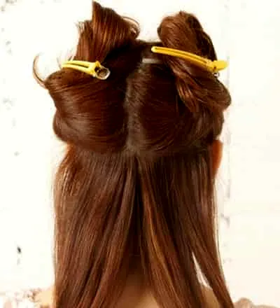 步骤三:如图所示,将卷好的头发分成上下左右四个区域,并用夹子将上面的两个区域头发分别夹起来。