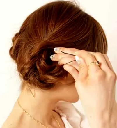 步骤七:挑选一款与发型和服饰相搭配的花朵发饰,夹在右侧盘好的小花苞上方。