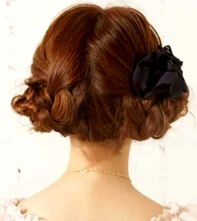 步骤六:弄好两侧的麻花辫后,用手将麻花辫向着耳朵后方的位置卷曲,盘起来后。用小发卡固定好,另外一边也使用相同的盘发方法。