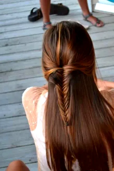小编点评:半扎鱼骨辫编发,今年大热的就是鱼骨辫了,简单的步骤很有心机的发型,散下来的直发很清纯,很有英伦范。