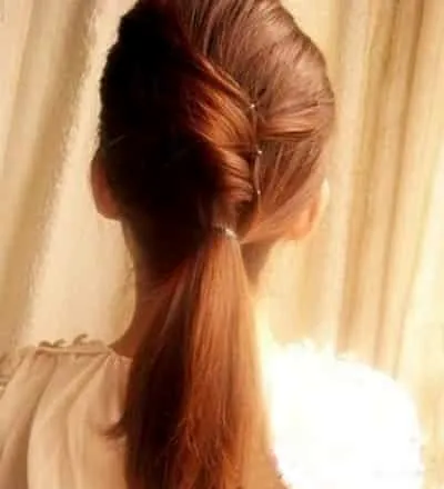 步骤三:弄好后。马尾处的头发就会如图,扭成麻花状,但并没有很凌乱。