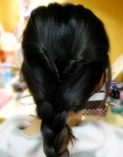步骤四:马尾处扭好后,再将剩下的下部分的头发编成麻花状。编的时候就要注意到麻花辫要编的紧实一点,松散的就没有效果了。